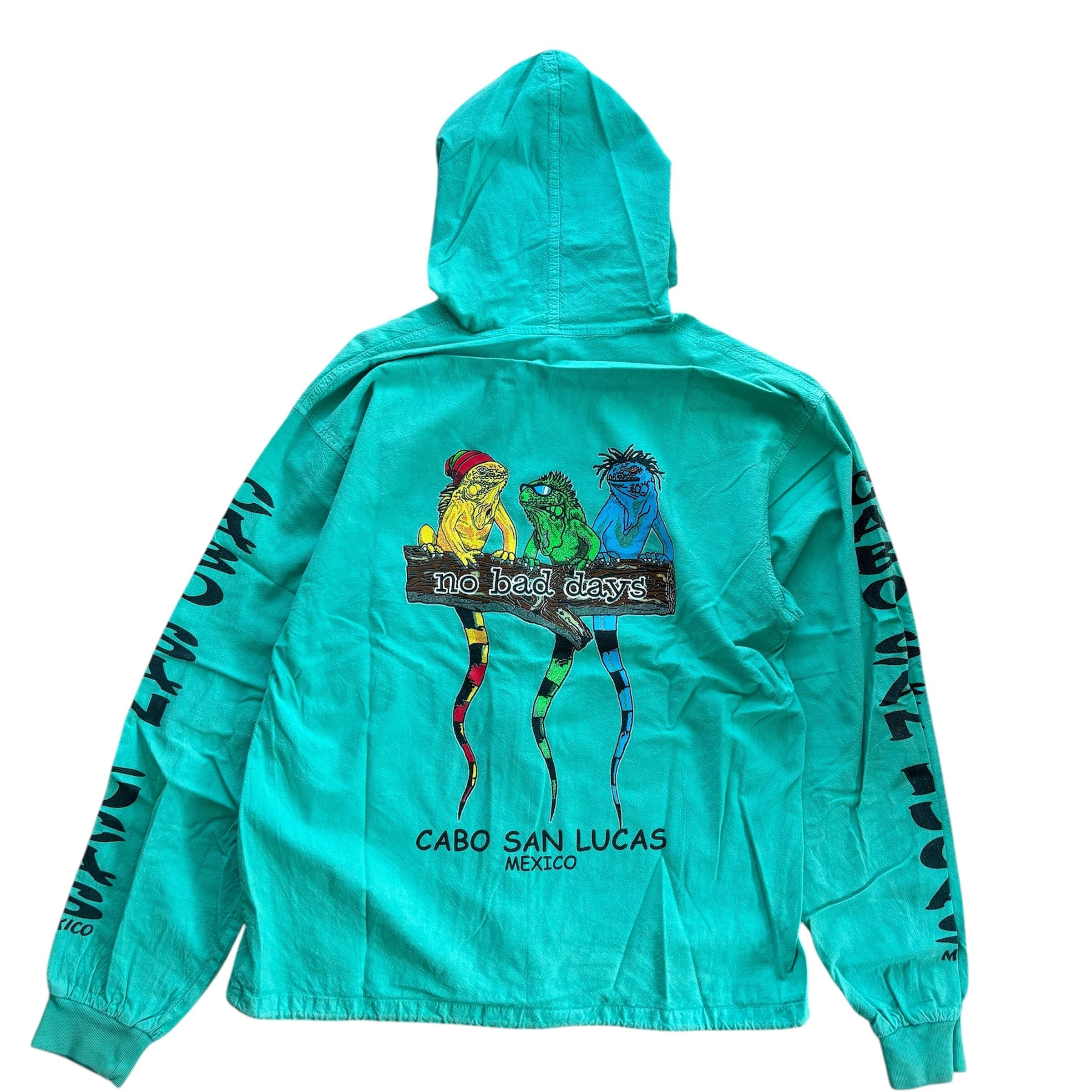 90年代メキシコ製、薄手の生地感のコットンフルジップパーカー。メキシコのCabo San Lucas(カボサンルカス)という観光地のデザインのようです。スーベニアのアイテムかと思われます。キャッチーなデザイン、両アームのロゴが雰囲気抜群!さらっと羽織れて暖かい季節のライトアウターとしてぴったりの1着です。