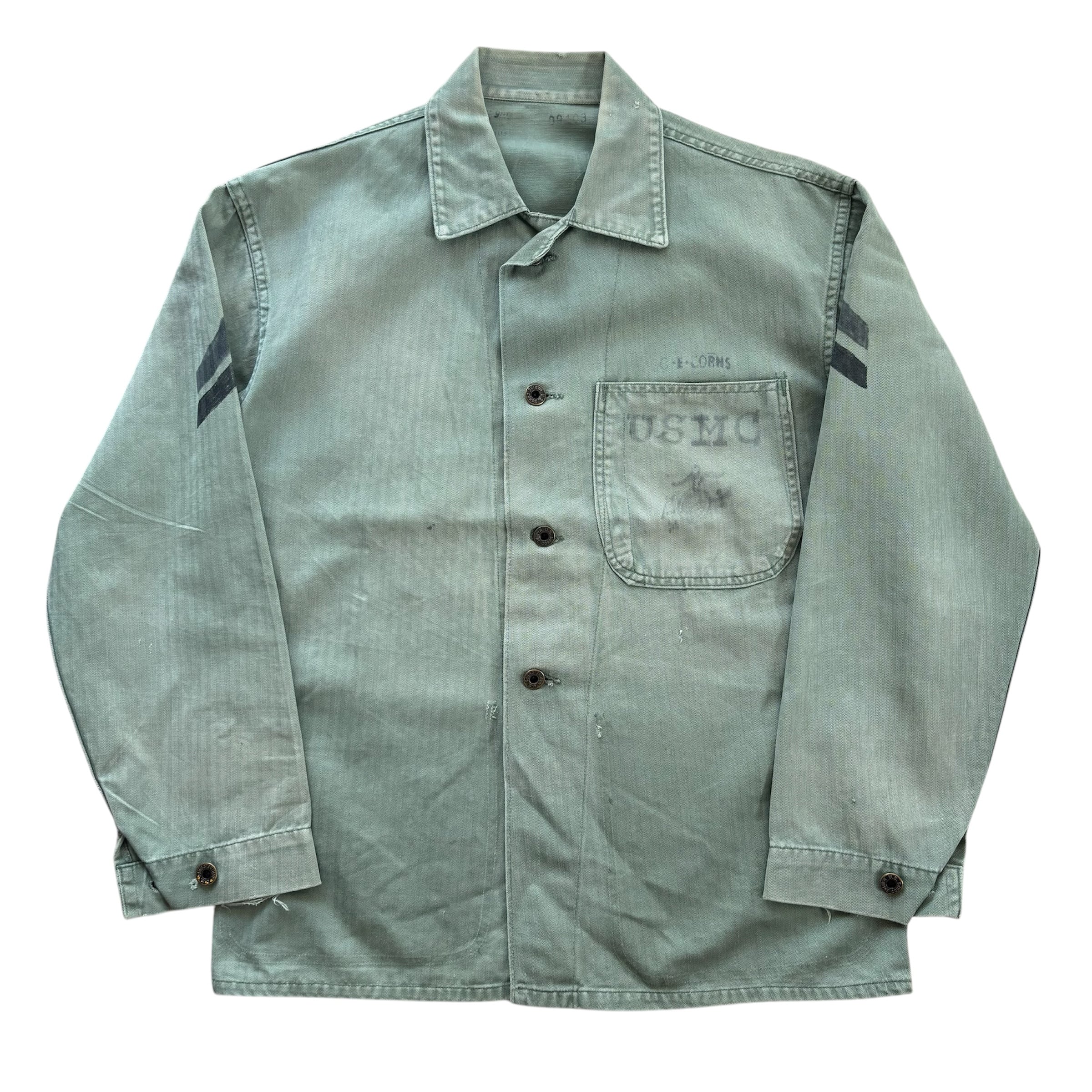 右胸ポケットに大きくUSMCのステンシル、腰ポケットはなくP-44のようなすっきりとしたボックスシルエットです。両腕には腕章が手描きされています。