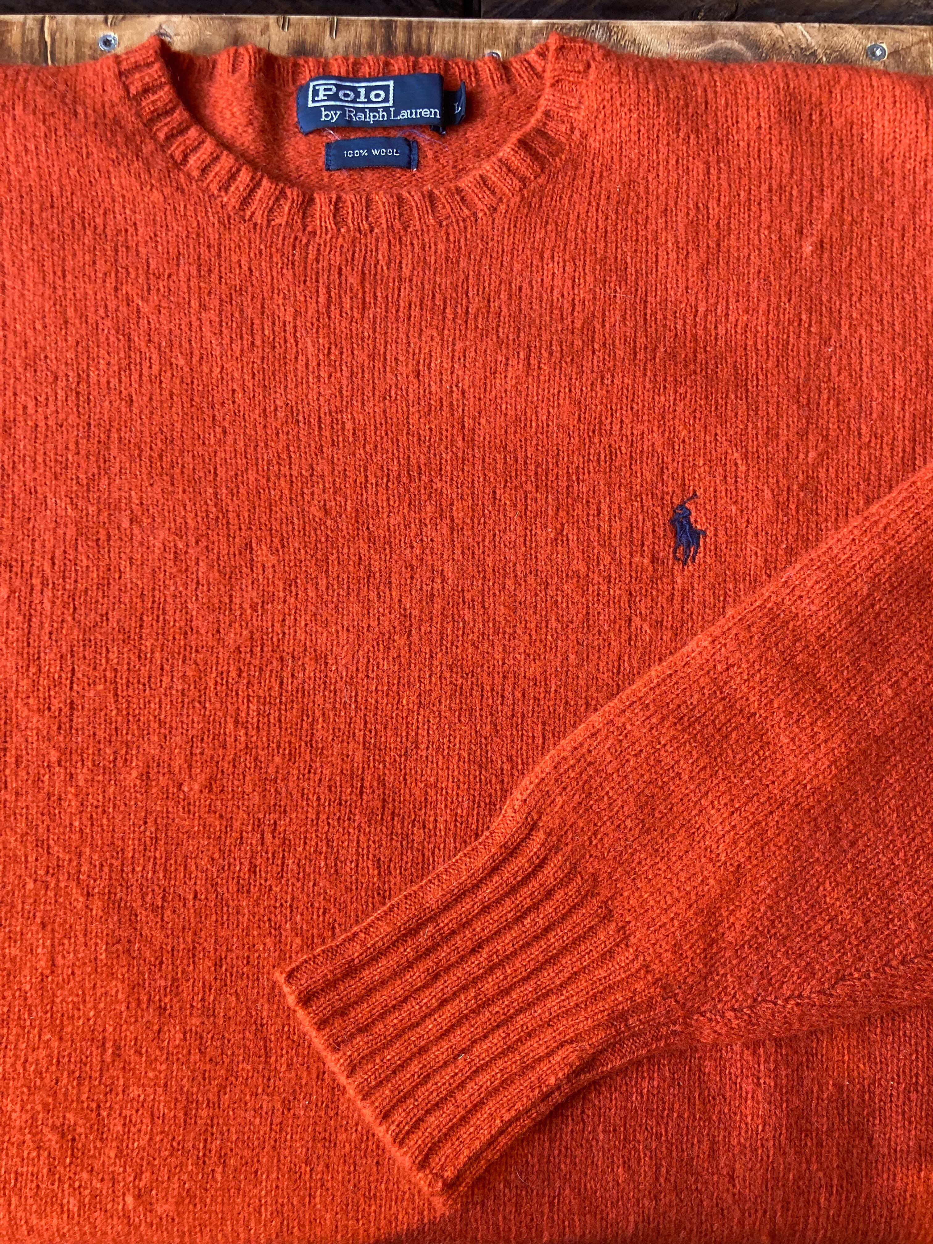 鮮やかなオレンジカラーのPOLOクルーネックニット。