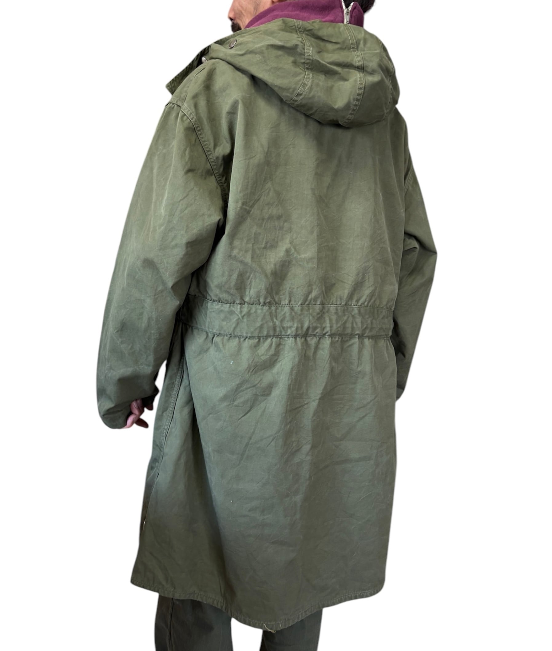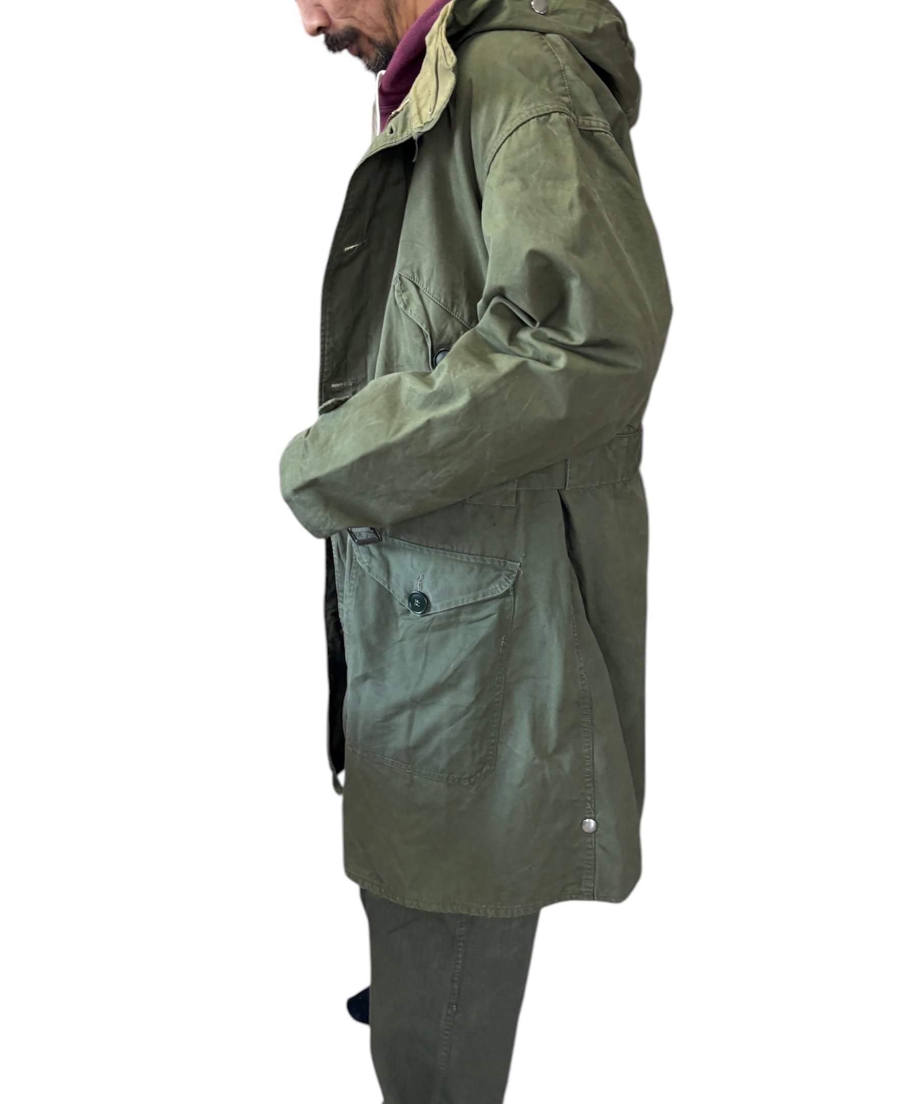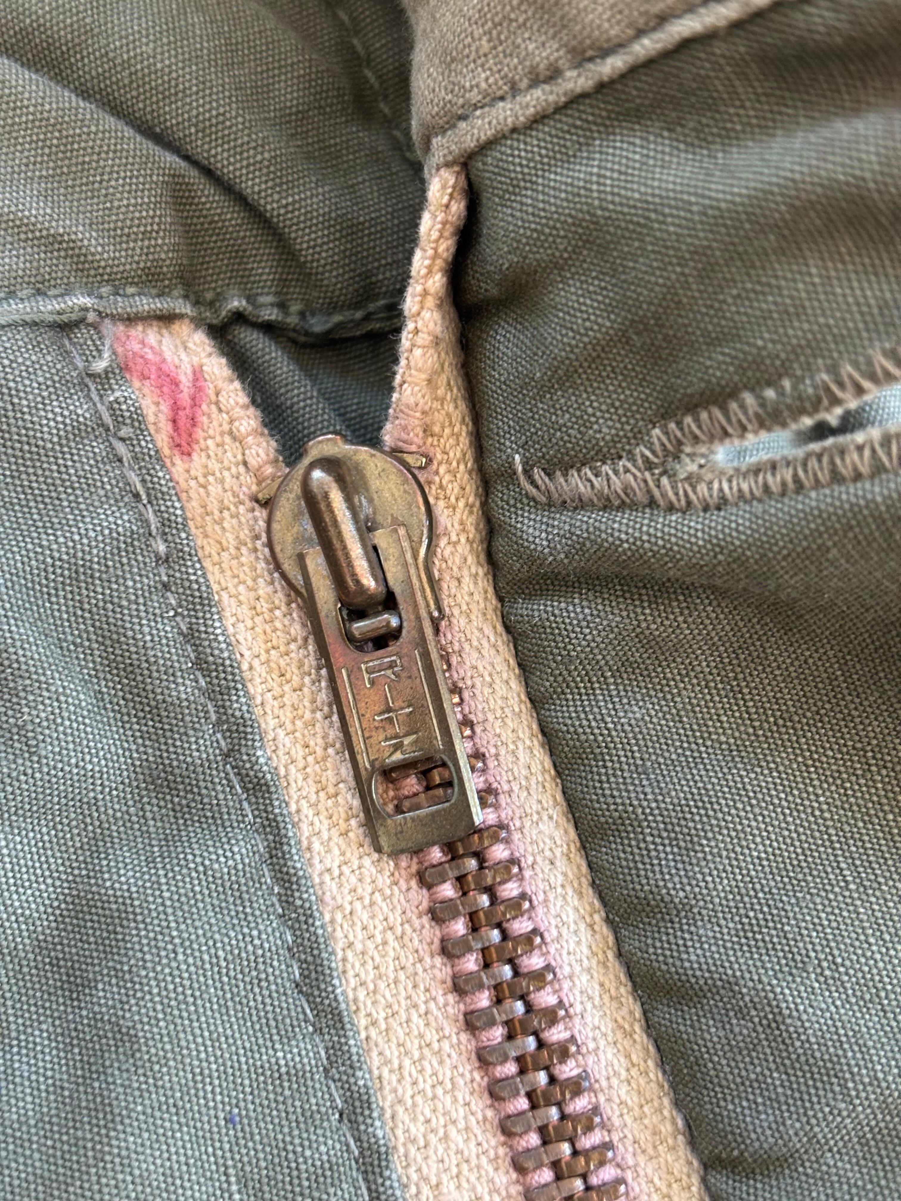 フロントはジップ仕様、ウエストベルト、大きめのボタン。